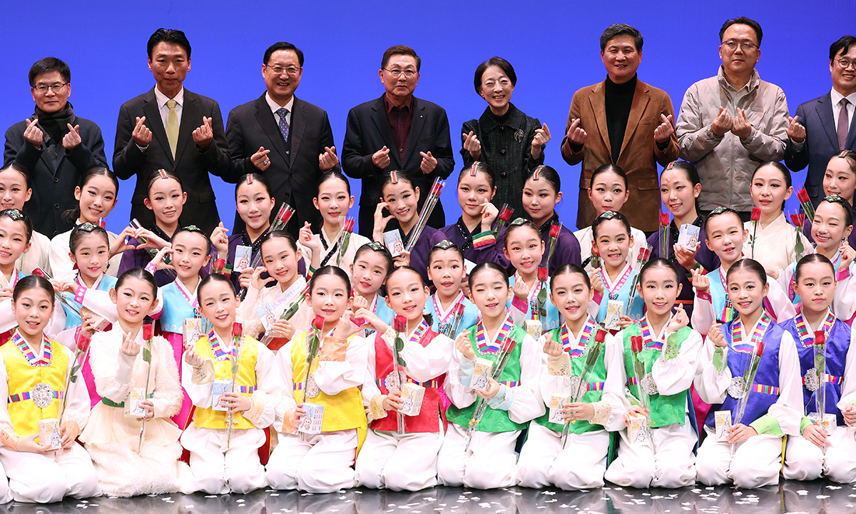 19일 서울 광진구 유니버설아트센터 대극장에서 열린 ‘이웃과 함께: 전통예술 문화나눔’ 제17회 리틀엔젤스 특별공연이 성황리에 마무리된 후 박정훈 세계일보 경영총괄 부사장(맨 뒷줄 왼쪽부터), 김문식 세계평화통일가정연합유지재단 이사장, 우종순 아시아투데이 회장, 문훈숙 한국문화재단 이사장 등이 리틀엔젤스 단원들과 기념촬영을 하고 있다. 공연에 앞서 세계일보는 자원봉사 애원 측에 성금을 전달했다.