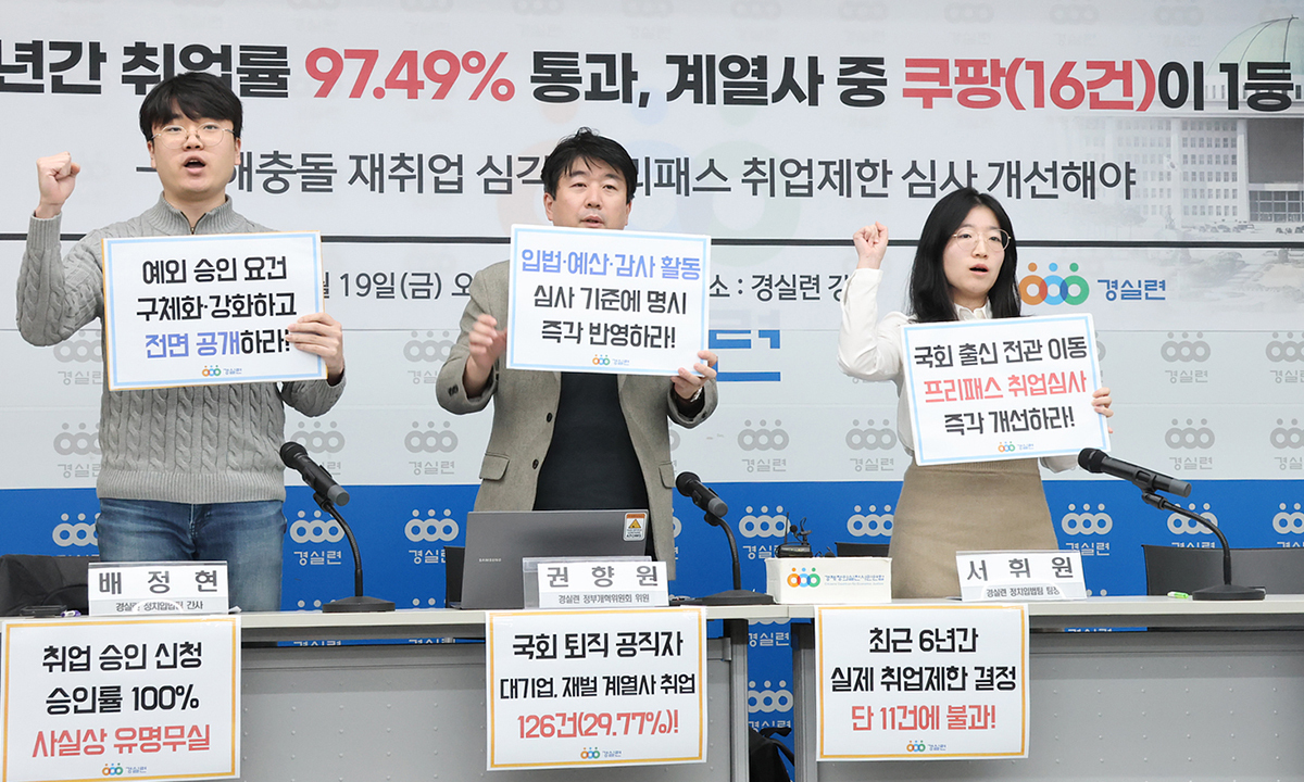경실련은 “국회는 입법·예산·국정감사 등 막강한 권한을 행사하는 기관”이라며 “국회 공직자가 퇴직 후 직무와 연관된 피감기관이나 대기업, 로펌 등으로 직행하는 것은 정경유착·전관예우를 야기한다”고 지적했다. 그러면서 “현행 제도의 가장 큰 맹점은 직무 관련성을 지나치게 협소하게 해석한다는 점”이라며 “국회공직자윤리위원회가 사실상 ‘취업 승인 발급처’로 기능하고 있다”고 비판했다. 단체는 국회의 취업 승인 요건 강화, 직무 관련성 심사 강화, 심사 결과 발표 시 구체적 사유 공개 의무화 등 제도개선을 촉구했다.
