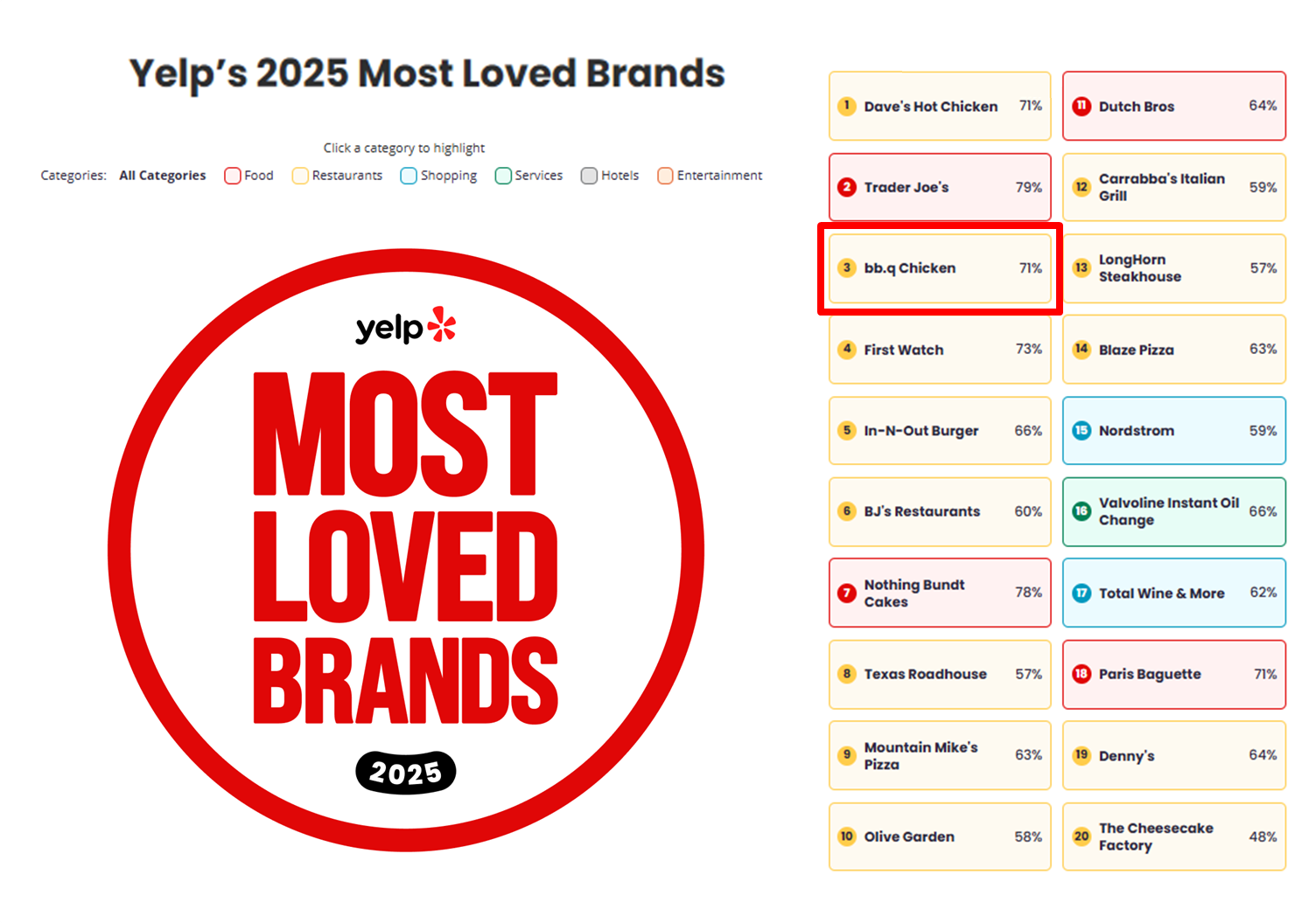 BBQ 치킨이 미국 최대 로컬 리뷰 플랫폼 ‘옐프(Yelp)’가 발표한 ‘2025년 미국에서 가장 사랑받는 브랜드(Most Loved Brands)’ 순위에서 전체 3위를 차지했다.