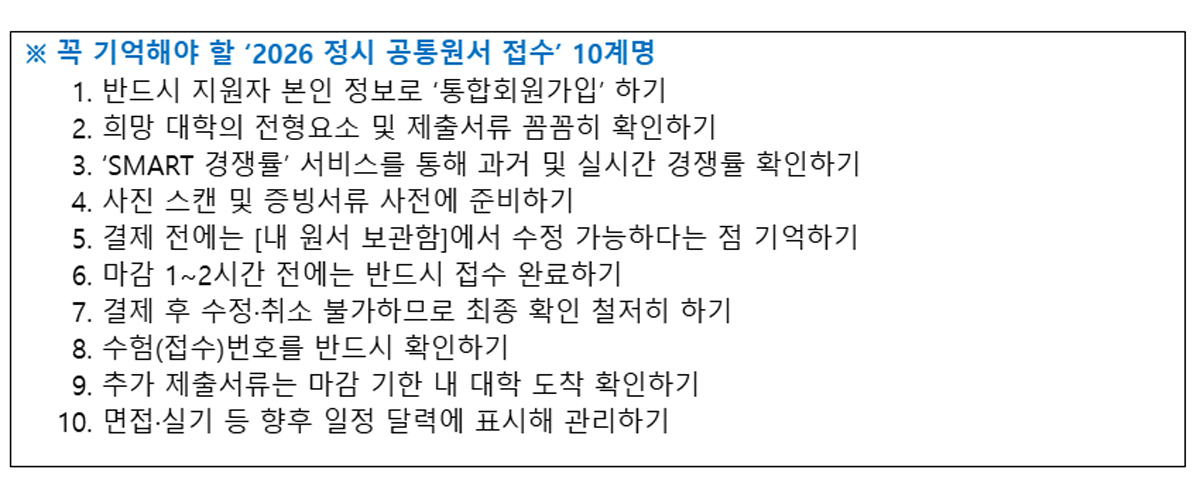 2026학년도 대입 정시 원서 접수가 29일부터 31일까지 진행된다. 수험생들은 고심해서 원서를 접수하지만, 사소한 실수로 불합격하는 사례도 종종 있다. 22일 진학사가 정시 원서접수를 앞두고 ‘2026 정시 원서접수 필수점검사항’을 Q&A 형식으로 정리했다.