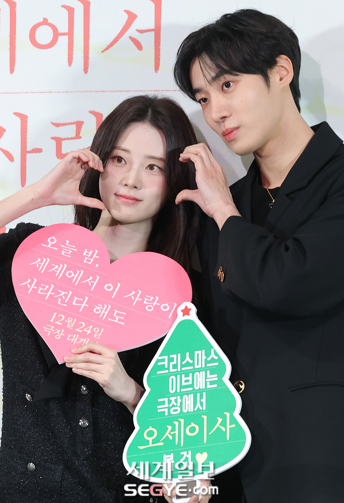 배우 신시아(사진 왼쪽)와 추영우가 22일 서울 용산구 용산CGV 아이파크몰점에서 열린 영화 '오늘 밤, 세계에서 이 사랑이 사라진다 해도'(감독 김혜영) 언론시사회에 참석해 포즈를 취하고 있다.