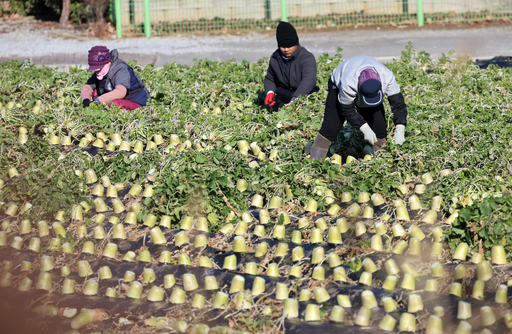22일 강원 강릉시 경포동 들녘에서 농민과 외국인 노동자들이 막바지 무 수확을 하느라 바쁘게 움직이고 있다.