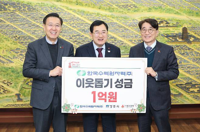 한국수력원자력이 연말연시를 맞아 23일 경주시청 내 사랑의 온도탑 앞에서 '희망2026 나눔캠페인'에 동참하기 위한 성금 1억 원을 경주시에 기탁했다고 밝혔다.