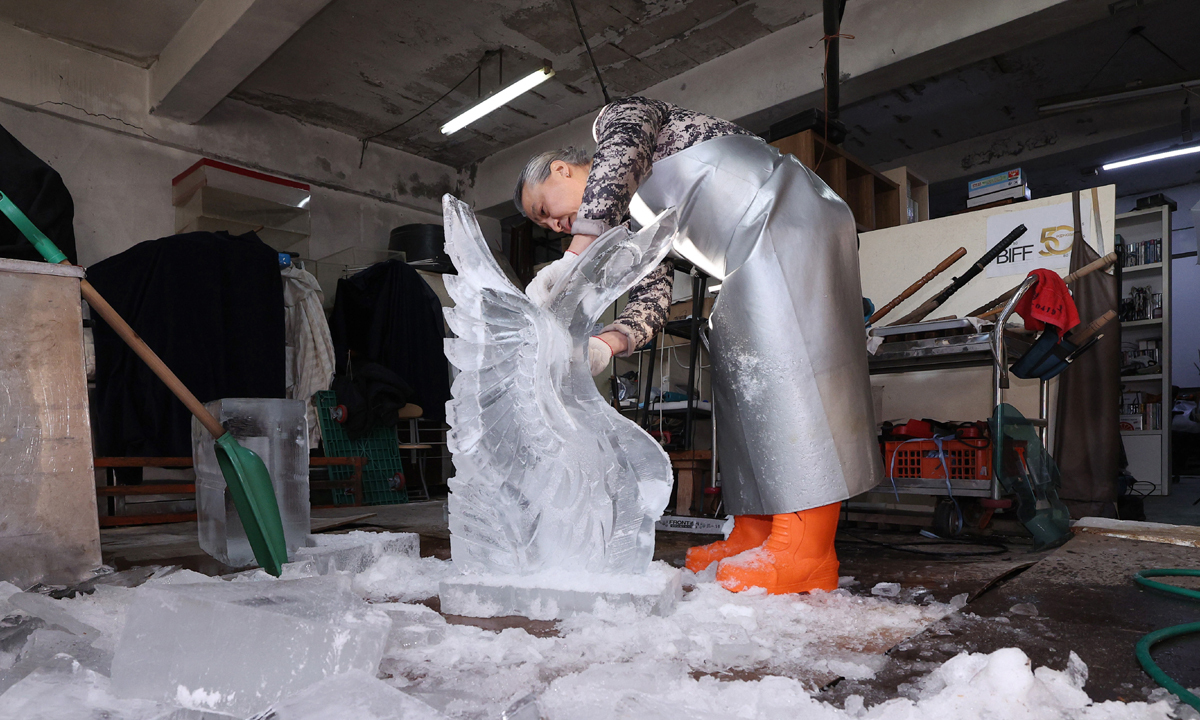 부산광역시 초읍동의 한 작업장. 차가운 냉기가 얼굴을 스쳤다. 냉동고 문을 열자 투명한 얼음 블록이 모습을 드러냈다. 문성호(52) 얼음조각가는 오늘도 말없이 얼음 앞에 섰다. 몇 시간 뒤면 얼음조각은 형태를 잃고 녹아 사라진다. 그 사실을 알면서도 얼음을 깎는다.