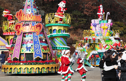 크리스마스를 하루 앞둔 24일 경기 용인시 에버랜드에서 진행된 ‘블링블링 X-mas 퍼레이드’에서 방문객들이 산타 복장을 한 연기자들의 공연을 보고 있다. 에버랜드 대표 캐릭터들이 등장하는 ‘산타마을 이야기’와 캐릭터들과 함께 사진을 촬영할 수 있는 ‘X-mas 포토타임’은 31일까지 진행된다.