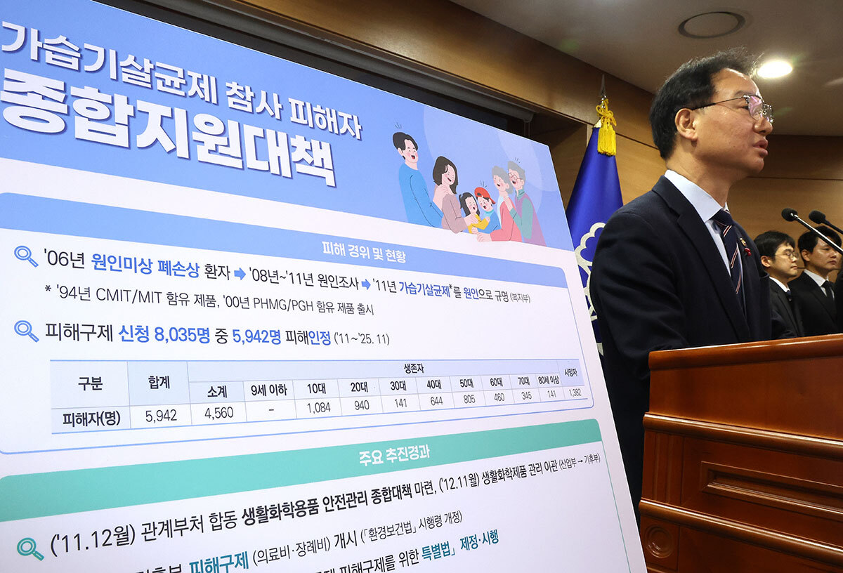 김영수 국무조정실 국무1차장이 24일 정부세종청사 브리핑실에서 ‘가습기살균제 참사 피해자 종합 지원대책’을 발표하고 있다.
