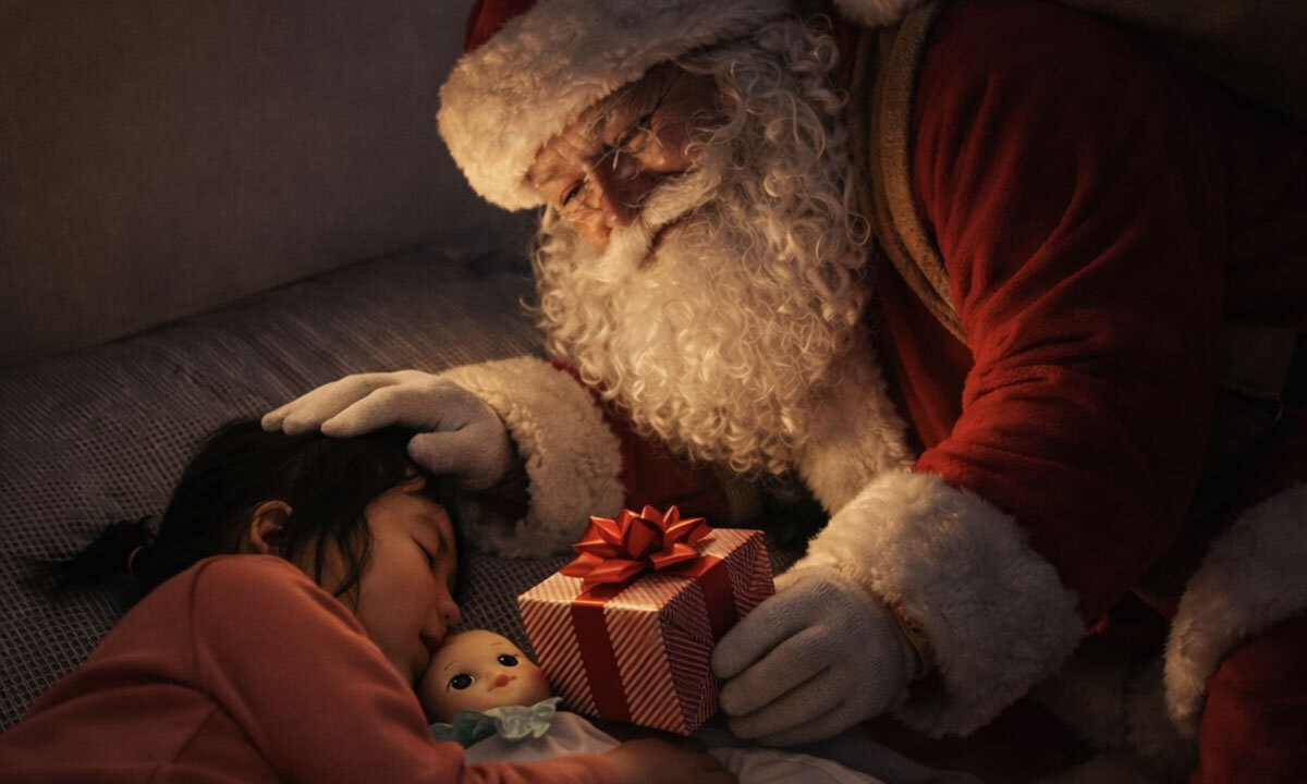 사진에는 선물을 든 산타가 한 손으로 잠든 아이의 머리를 쓰다듬는 모습이 담겼다.