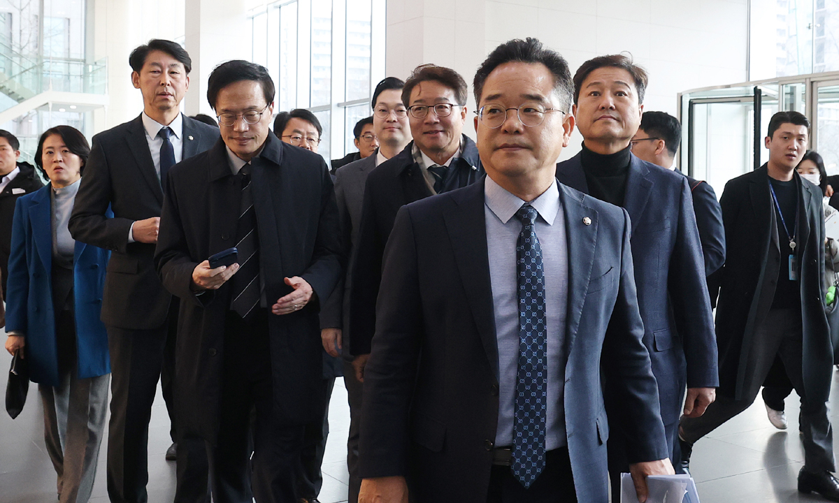 더불어민주당 을지로위원회 민병덕 위원장과 소속 의원들이 지난 24일 3370만 건의 개인정보 유출사고가 발생한 서울 송파구 쿠팡 본사를 항의 방문해 경영진 면담을 위해 이동하고 있다. 뉴스1