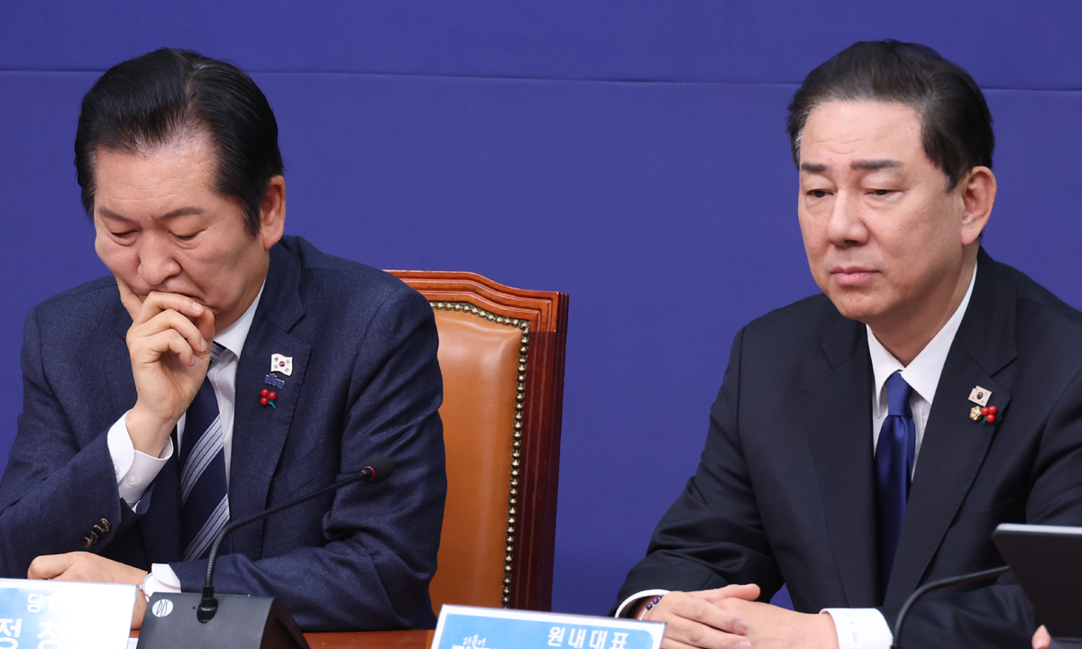 더불어민주당 정청래 대표(왼쪽), 김병기 원내대표가 24일 서울 여의도 국회에서 열린 최고위원회의에서 최고위원의 발언을 듣고 있다. 허정호 선임기자