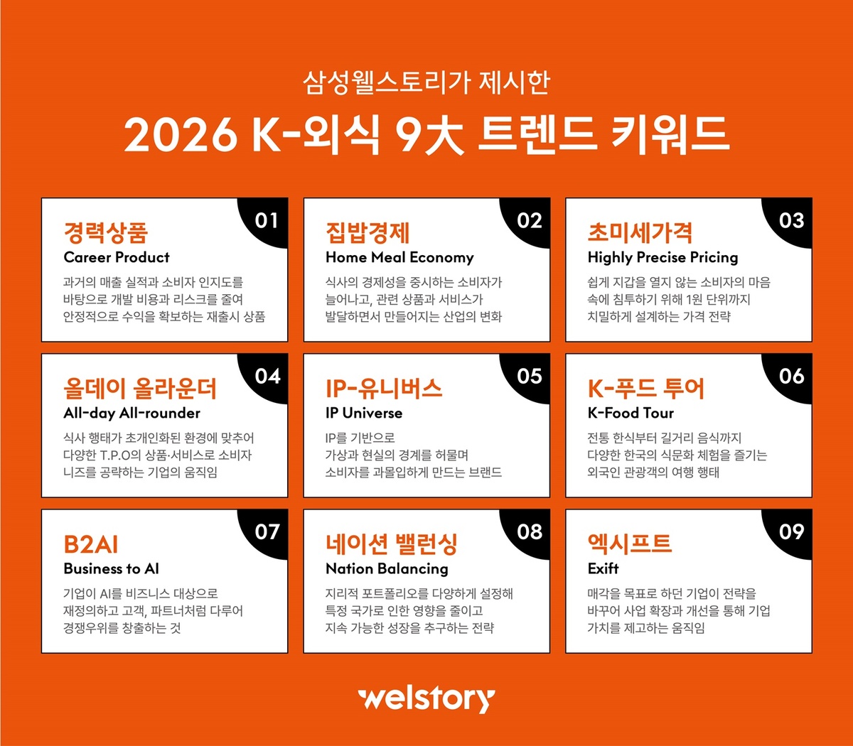 삼성웰스토리가 제시한 2026년 K-외식 트렌드의 9대 키워드는 △경력상품 △B2AI(Business to AI) △K-푸드 투어 △집밥경제 △초미세가격 △올데이 올라운더 △IP-유니버스 △네이션 밸런싱 △엑시프트(Exit+Shift)다.