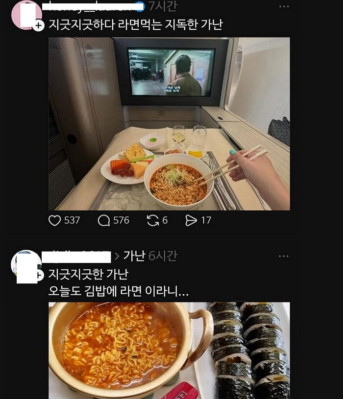 최근 사회관계망서비스(SNS)에는 비행기 1등석에서 라면을 먹으며 “이 지긋지긋한 가난”이라고 적거나, 억대 수입차 열쇠와 함께 “오늘도 김밥에 라면이다”라는 글을 올린 사진들이 공유되고 있다.