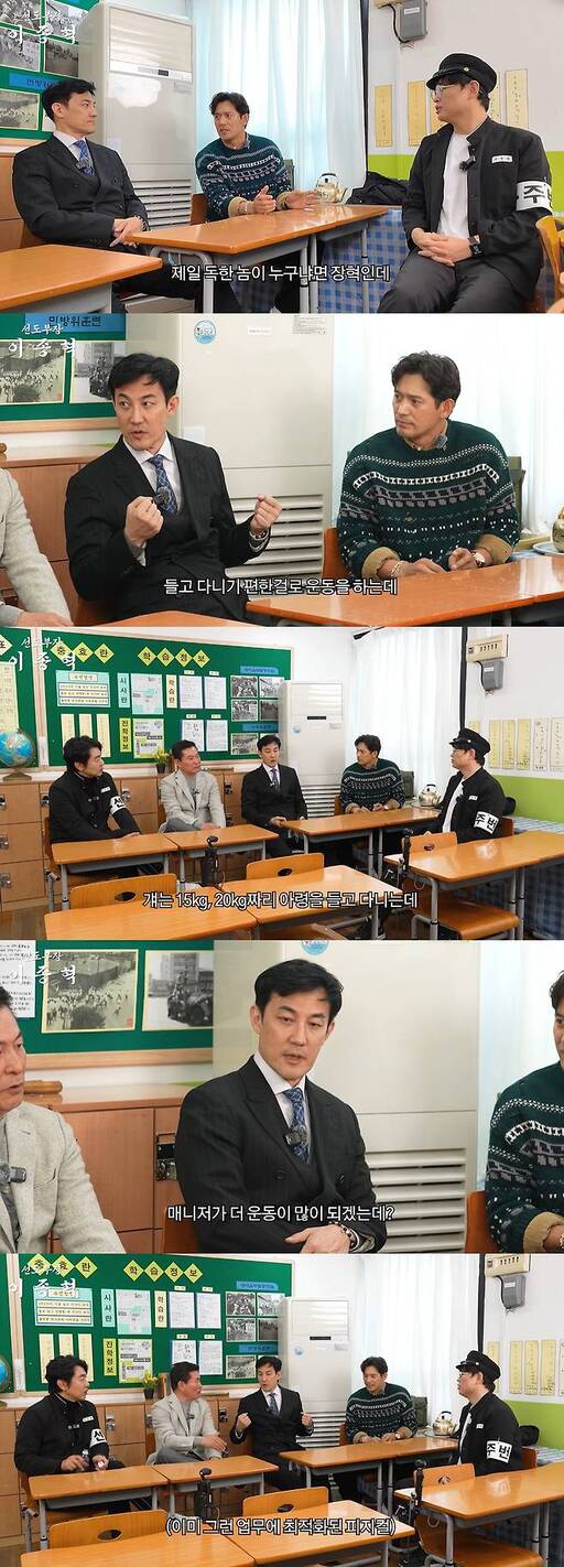 한정수는 "나는 매니저에게 미안해서 절대 무거운 걸 안 들고 다녔다. 아령 같은 거 안 들고 밴드 같이 가벼운 것으로 했다. 들고 다니기 편한 것으로 운동했다"고 말했다.