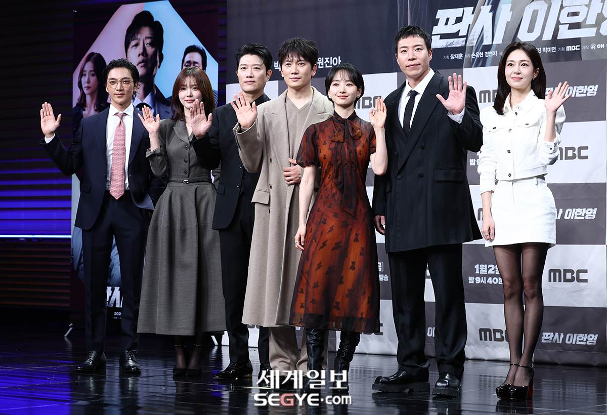 배우 황희, 오세영, 박희순, 지성, 원진아, 태원석, 백진희(사진 왼쪽부터)가 2일 서울 마포구 상암동 MBC 신사옥에서 열린 새 금토드라마 ’판사 이한영’의 제작발표회에 참석해 포즈를 취하고 있다.