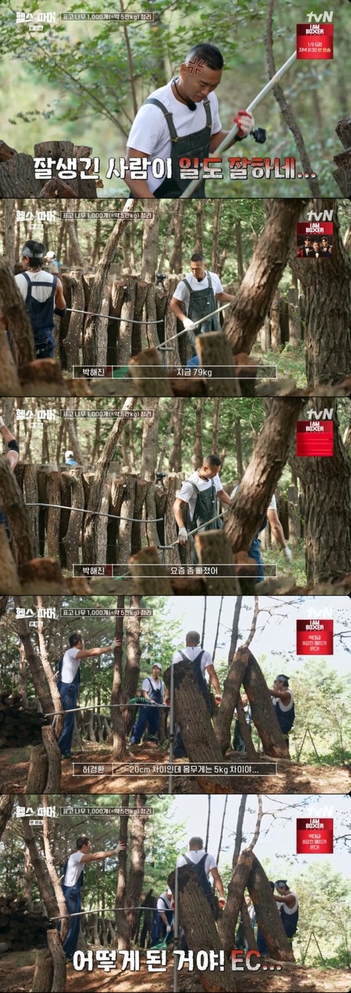 아모띠와 친분으로 이번 회차에 특별 출연한 박해진은 높은 작업 강도에도 남다른 실력을 보여주며 폐목을 정리했다.