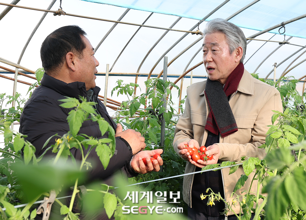 강호동(사진 오른쪽) 농협중앙회장이 5일 충남 논산 강경농협에서 열린 ‘농협금융-농협경제 보급형 스마트팜 협력사업 기념식’을 갖고 스마트팜 농장주와 대화를 하고 있다.