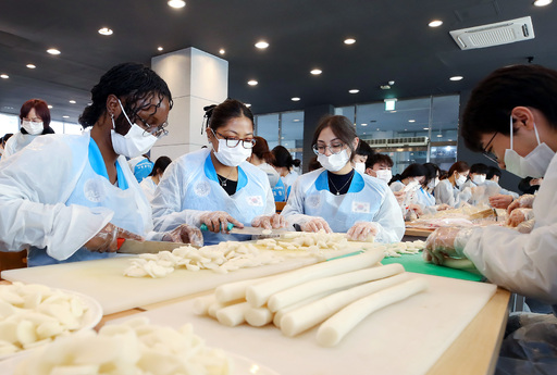 5일 경북 경산시 영남대 경산캠퍼스 학생회관에서 열린 ‘제5회 사랑의 떡국 나눔’ 행사에서 외국인 유학생들이 가래떡을 썰고 있다. 영남대 학생과 교직원으로 구성된 ‘YU 사회공헌단’ 등 100여명이 만든 떡국 밀키트는 인근 지역 어려운 이웃들에게 전달된다.