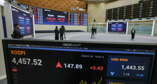 5일 서울 여의도 한국거래소 모니터에 코스피 지수와 원·달러 환율이 표시되고 있다. 이날 코스피는 삼성전자(7.47%), SK하이닉스(2.81%) 등 반도체 대형주의 상승세에 힘입어 역대 최고치인 4457.52로 장을 마감했다. 원·달러 환율은 지난달 31일부터 3거래일 연속 상승하며 1443.8원에 주간 거래(오후 3시30분)를 마쳤다.
