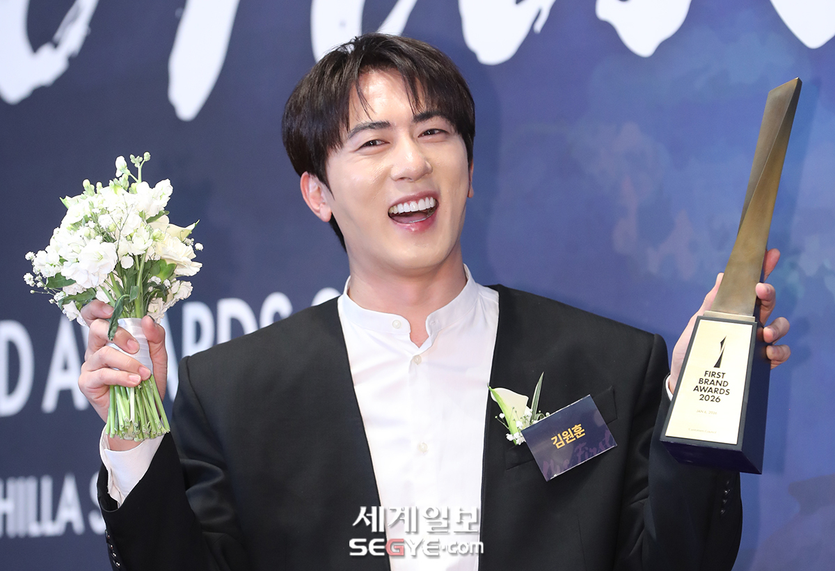 개그맨 김원훈이 6일 서울 중구 신라호텔에서 열린 '2026 대한민국 퍼스트브랜드 대상' 포토월 행사에 참석해 포즈를 취하고 있다.