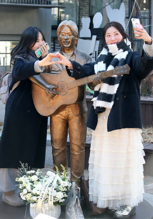 ‘영원한 가객’ 고 김광석(1964∼1996) 사망 30주기인 6일 대구 중구 방천시장 김광석길을 찾은 시민들이 김광석 동상 옆에서 기념촬영을 하고 있다.