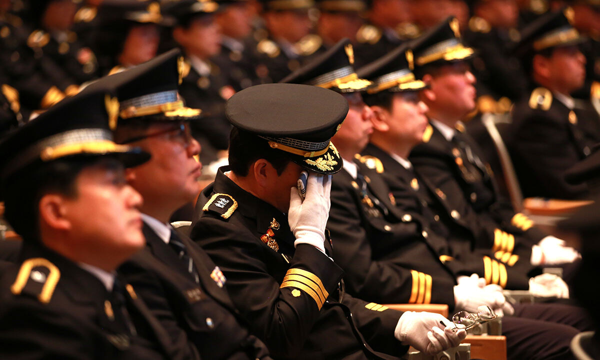 6일 전북 전주시 전북경찰청 온고을홀에서 전북경찰청장장(葬)으로 엄수된 고 이승철 경정(추서계급) 영결식에서 한 경찰관이 눈물을 닦고 있다. 이 경정은 지난 4일 서해안고속도로 상행선 고창 분기점 인근 도로에서 교통사고를 수습하던 중 30대 운전자가 몰던 스포츠유틸리티차량(SUV)에 치여 순직했다.