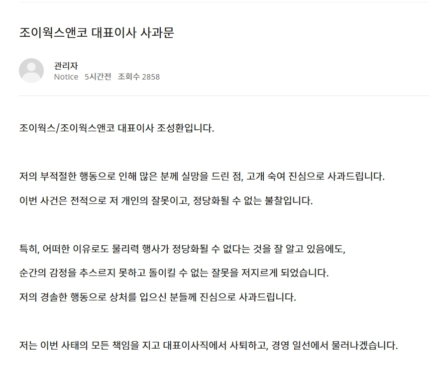 조 대표는 7일 회사를 통해 전한 입장문에서 ”저의 부적절한 행동으로 많은 분께 분노와 실망을 드려 고개 숙여 진심으로 사과한다“며 ”이번 사건은 전적으로 저 개인의 잘못이고 정당화할 수 없는 불찰“이라고 말했다.