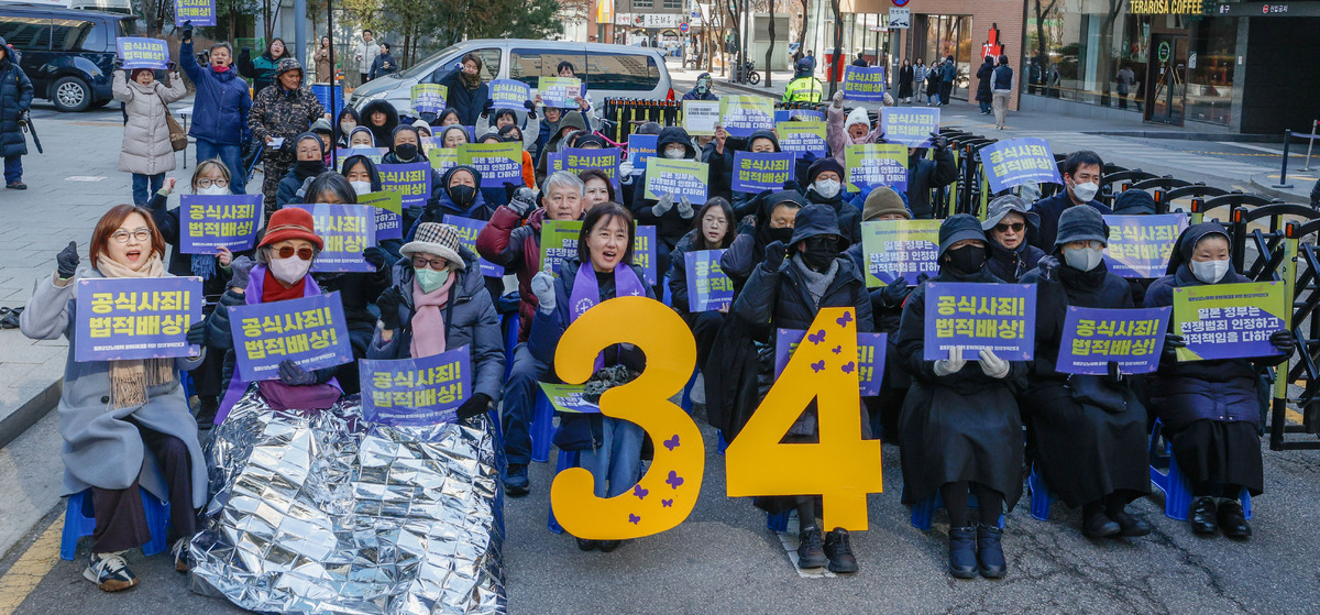 정의연은 7일 낮 서울 종로구 옛 주한 일본대사관 인근에서 일본군 성노예제 문제 해결을 위한 정기 수요시위를 열고 이같이 밝혔다. 1992년 1월 8일 시작된 수요시위는 34주년을 하루 앞두고 있다.