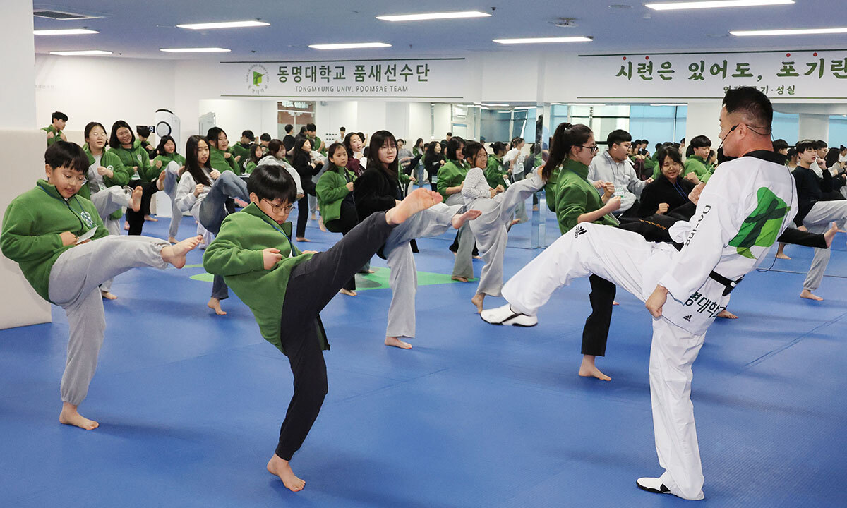 7일 부산 남구 동명대에서 ‘겨울방학 인성 영어·수학캠프’에 참여 중인 예비 중학생 80여명이 태권도 발차기를 배우고 있다. 동명대는 5일부터 3주간 겨울방학 중 학습 공백 해소를 위해 몰입형 영어·수학 수업과 인성 함양 프로그램, 대학 특화 프로그램 등을 진행한다.