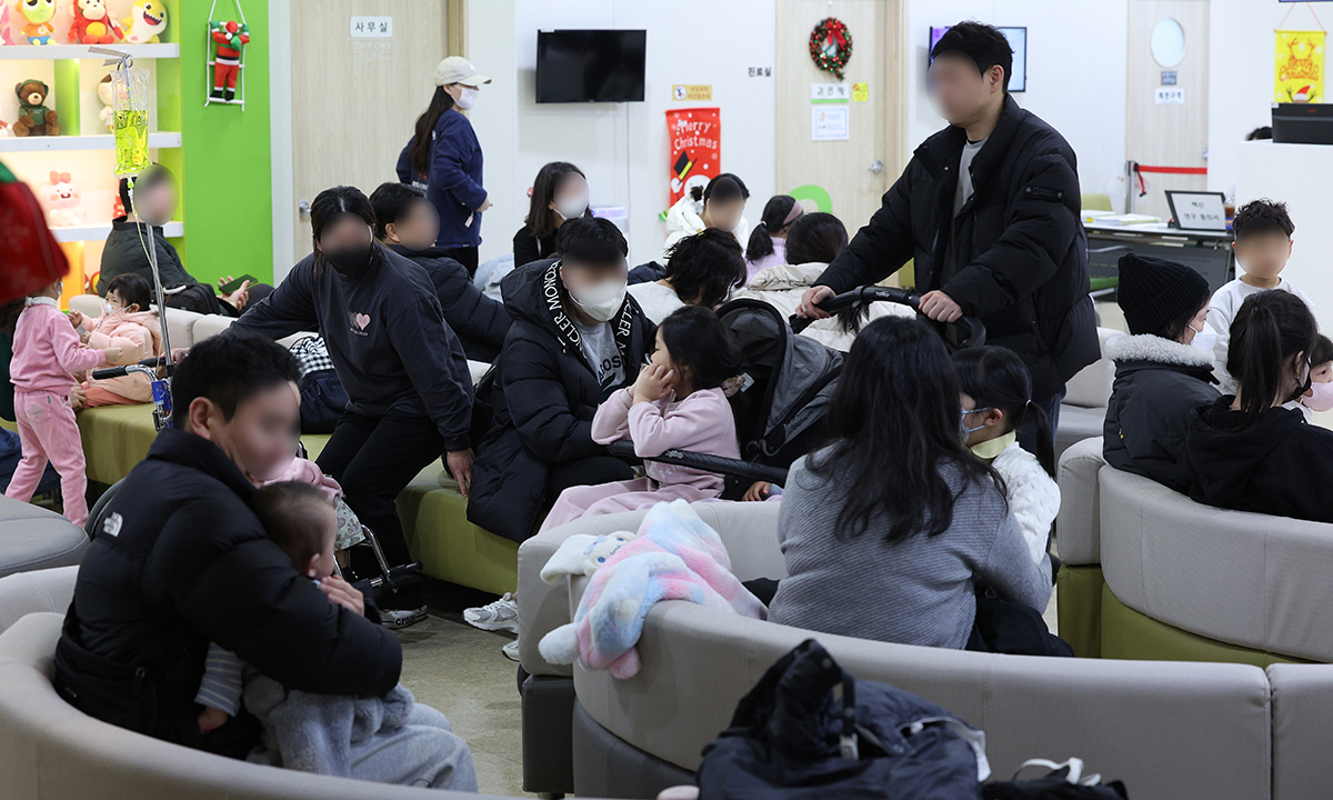 영하권 강추위가 이어지고 있는 7일 서울 시내 한 소아청소년과 의원이 진료 대기 중인 어린이 환자와 보호자로 북적이고 있다.