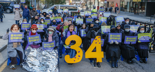 7일 서울 종로구 옛 주한 일본대사관 인근에서 열린 ‘제1734차 일본군성노예제 문제해결을 위한 정기 수요시위’에서 참가자들이 구호를 외치고 있다. 1992년 1월 8일 시작된 수요시위는 34주년을 하루 앞두고 있다.