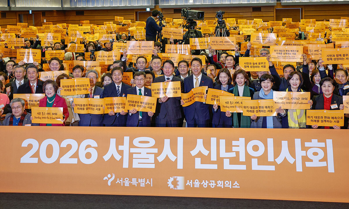 7일 서울 중구 대한상공회의소에서 열린 ‘2026 서울시 신년인사회’에서 오세훈 서울시장(가운데 오른쪽)과 최태원 대한상공회의소 회장(〃 왼쪽) 등 참석자들이 새해 희망 퍼포먼스를 하고 있다. 서울시는 행사 후 종로구 한 호텔에서 주한 외교사절과 신년간담회를 열었다.