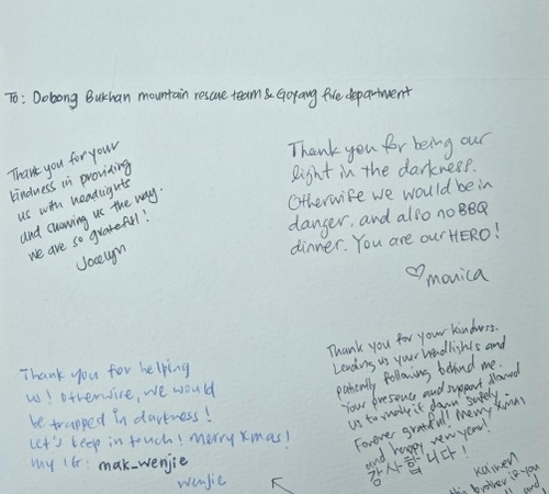 북한산에서 조난됐다가 119 대원에 의해 구조된 싱가포르인들이 귀국 후 감사 편지를 보냈다.