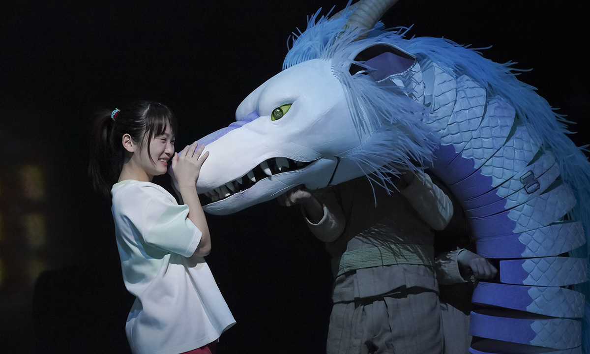 연극 ‘센과 치히로의 행방불명’에서 주인공 치히로가 하룡(河龍) 하쿠와 대화하고 있다. 판타지 무대극으로서 용과 각종 신 등이 사람 손으로 움직이는 인형 등 아날로그적인 방식으로 등장해서 연기를 펼친다. TOHO 제공