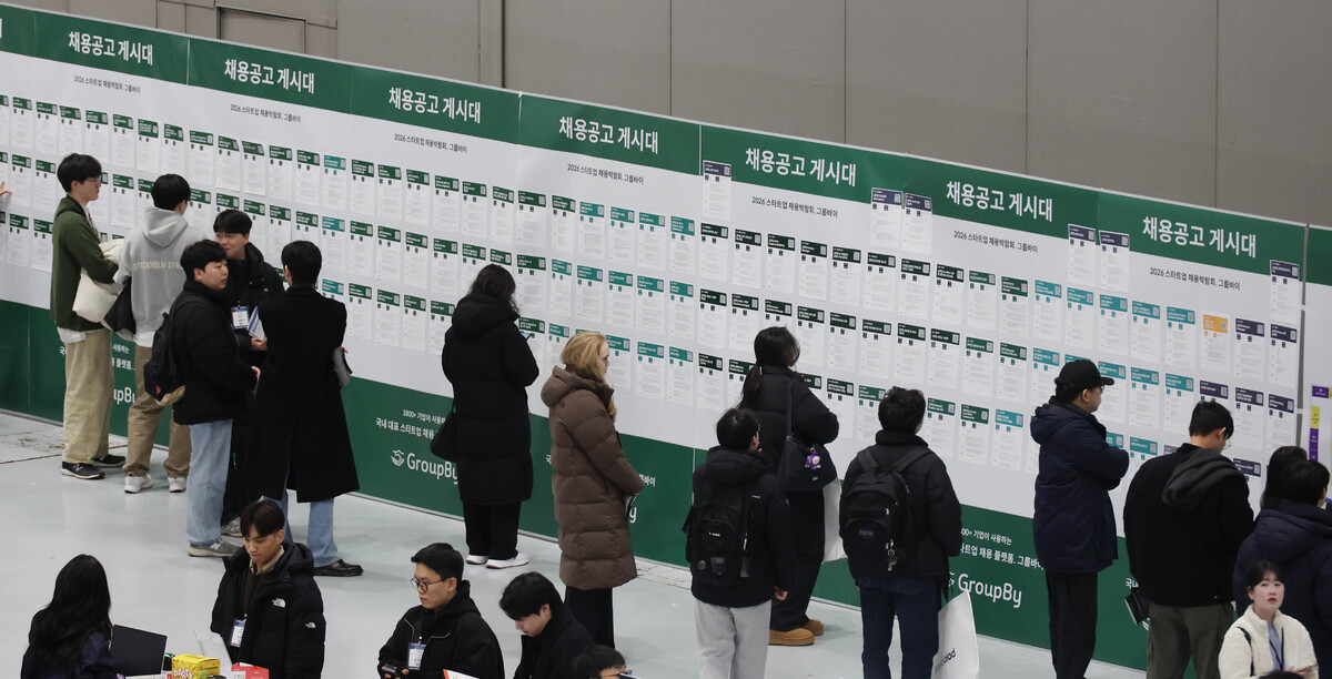 11일 서울 강남구 코엑스에서 열린 '2026 스타트업 채용박람회'에서 참가자들이 채용공고 게시대를 살펴보고 있다.