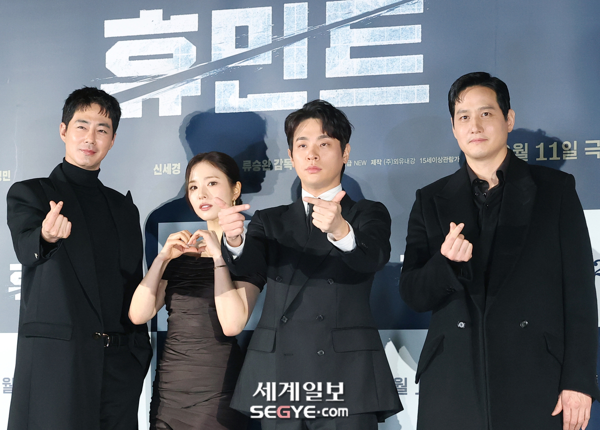 배우 조인성, 신세경, 박정민, 박해준(사진 왼쪽부터)이 12일 서울 광진구 롯데시네마 건대입구에서 열린 영화 '휴민트‘(감독 류승완) 제작보고회에 참석해 포즈를 취하고 있다.