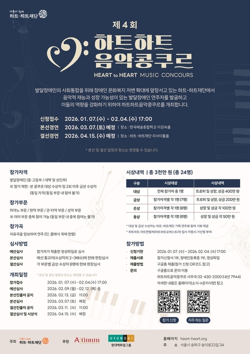 하트-하트재단은 발달장애인의 사회 통합을 돕고 발달장애인 연주자를 발굴하고자 ‘제4회 하트하트음악콩쿠르’를 개최한다고 12일 밝혔다. 행사는 중·고등부와 대학 및 성인부의 발달장애인을 대상으로 하며, 참가 부문은 피아노, 현악, 관·타악, 성악으로 나뉜다.