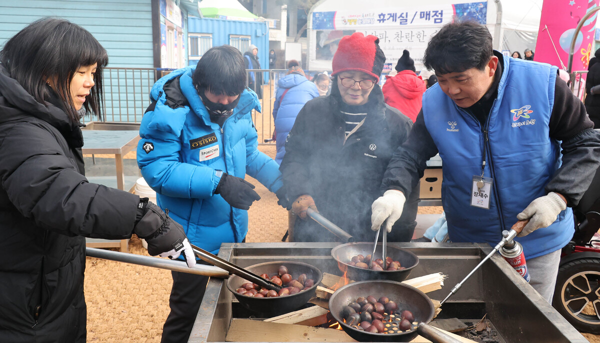 겨울 테마파크 2026 노원 눈썰매장 장애인 가족 초청행사가 열린 12일 서울 노원구 한국과학기술대학교에 마련된 행사장에서 참가자들이 군밤 굽기 체험을 하고 있다.