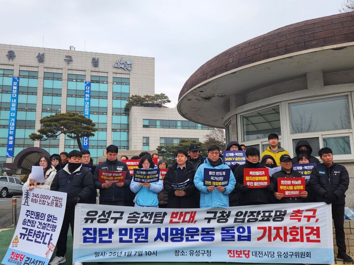 대전환경운동연합과 진보당 대전시당 등으로 구성된 대전송전탑건설백지화대책위원회는 최근 유성구청 앞에서 기자회견을 열어 “용인 국가산단에 필요한 16GW의 전력을 지방에서 끌어다 쓰기 위한 것으로 지역을 ‘에너지 식민지’로 만드는 수탈 정책”이라고 비판했다.