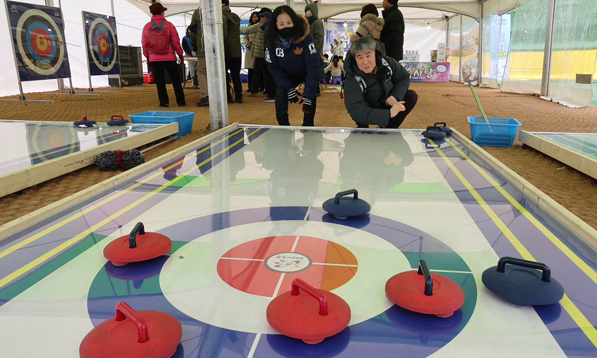12일 서울 노원구 한국과학기술대학교에서 열린 ‘2026 노원 눈썰매장 장애인 가족 초청행사’에서 참가자들이 컬링 체험을 하고 있다.