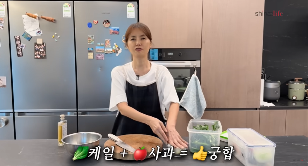 지난 7일 신애라가 자신의 유튜브 채널 ‘신애라이프’의 ‘5분이면 끝! 평생 먹어도 좋은 샐러드 같이 먹어요~^^’영상을 통해 짧은 시간 안에 만들 수 있는 ‘사과 케일 샐러드’ 조리법을 소개했다.