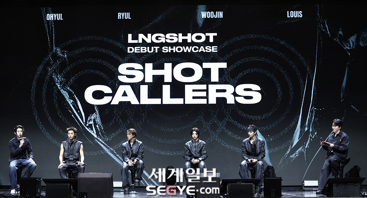 가수 박재범(사진 왼쪽)과 보이그룹 롱샷이 13일 서울 영등포구 명화 라이브홀에서 열린 데뷔 EP '샷 콜러스'(SHOT CALLERS)의 쇼케이스에 참석해 대화를 나누고 있다.