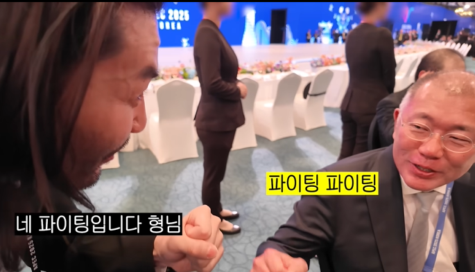 그러자 정의선 회장은 "어? 잘 있었어? 어디 앉아 있어?"라며 친근한 말투로 답했고, "오늘 경호처랑 같이 하고 있어가지고 왔다갔다 하고 있습니다"라는 노홍철의 답변에 "잘해"라고 응원을 건넸다.