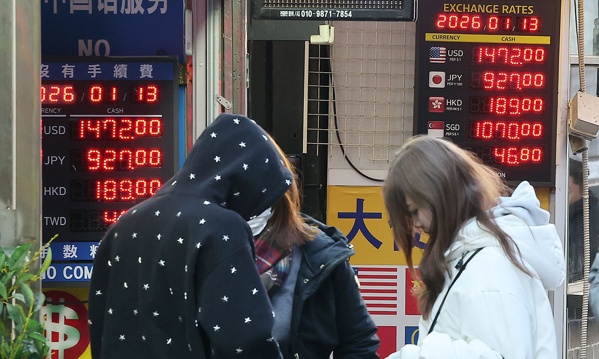원·달러 환율이 1470원을 돌파한 13일 오전 서울 중구 명동의 한 환전소 앞에서 외국인 관광객들이 환전하려고 지갑을 열고 있다. 이날 원·달러 환율은 이란의 군사적 긴장과 그린란드에 대한 미국의 영유권 확보 시도 등 지정학적 리스크로 인해 서울외환시장에서 전장 대비 5.30원 오른 1473.70원에 주간 거래를 마쳤다.
