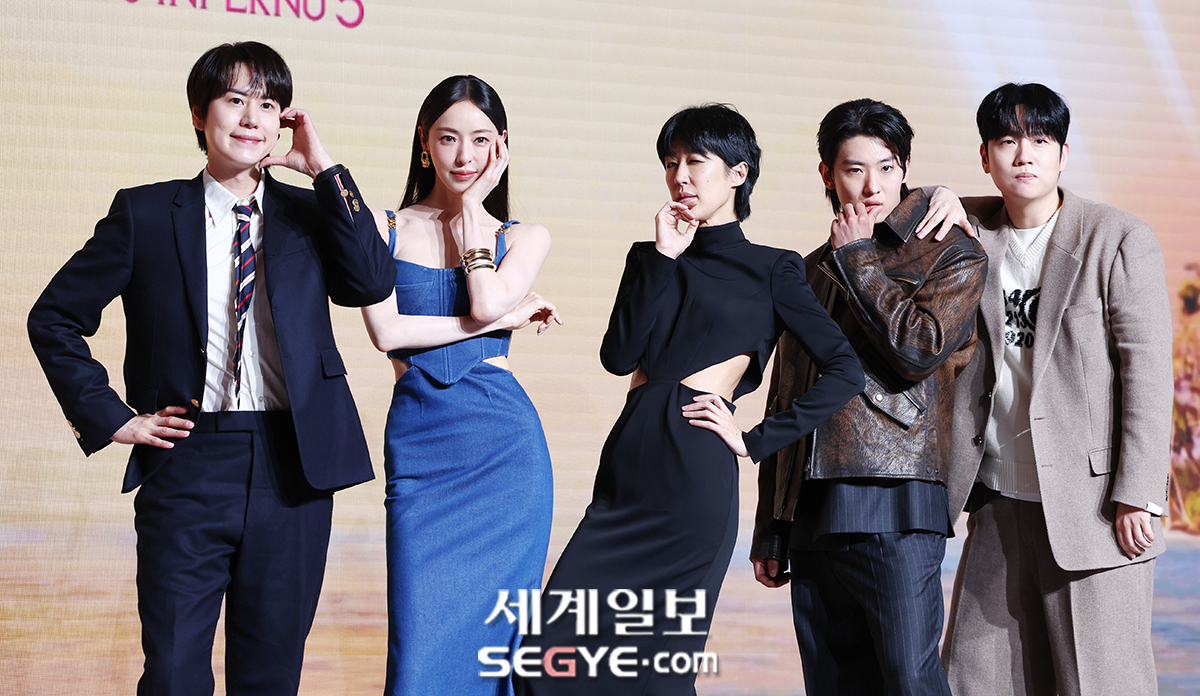 규현, 이다희, 홍진경, 덱스, 한해(사진 왼쪽부터)가 14일 서울 마포구 호텔나루에서 진행된 넷플릭스 예능 '솔로지옥 시즌5' 제작발표회에 참석해 포즈를 취하고 있다.