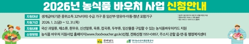 지원 기간은 올해 12월까지이며, 신청은 주민등록 주소지 관할 읍·면·동 행정복지센터를 직접 방문하거나 농식품 바우처 누리집, 전화를 통해 가능하다. 다만, 지난해 이미 지원을 받았던 가구 중 현재까지 자격 요건을 유지하고 있는 경우에는 별도의 절차 없이 자동 신청된다.