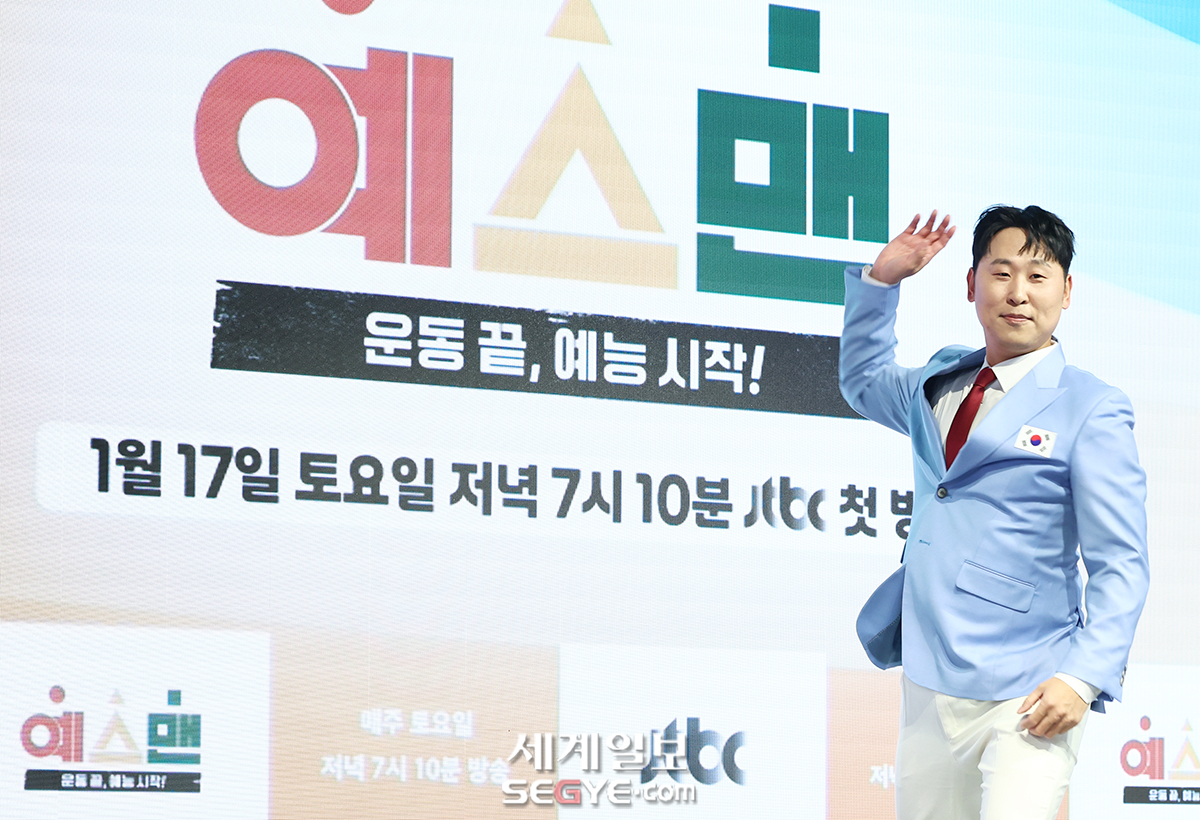전 야구 선수 윤석민이 14일 오후 서울 영등포구 페어몬트호텔에서 열린 JTBC 예능 '예스맨' 제작발표회에 참석해 포즈를 취하고 있다.