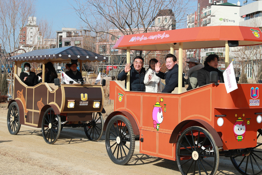 14일 ‘울산 마차’ 시승식이 열린 중구 태화강 국가정원에서 김두겸 울산시장 등 관계자들이 어린이, 연인들과 함께 안전 및 불편사항을 점검하고 있다. 울산 마차는 ‘꿀잼도시 울산’을 구현하기 위한 관광 콘텐츠로 3월부터 본격 운영에 들어간다.