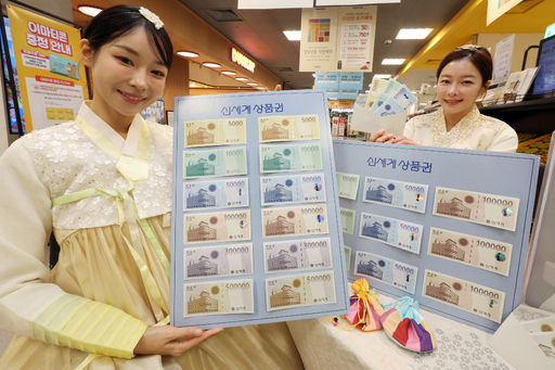 14일 서울 용산구 이마트 용산점에서 모델들이 설을 앞두고 신세계상품권을 소개하고 있다. 상품권은 금액대가 5000원부터 50만원까지 다양하며 전국 이마트 및 트레이더스 매장에서 살 수 있다.