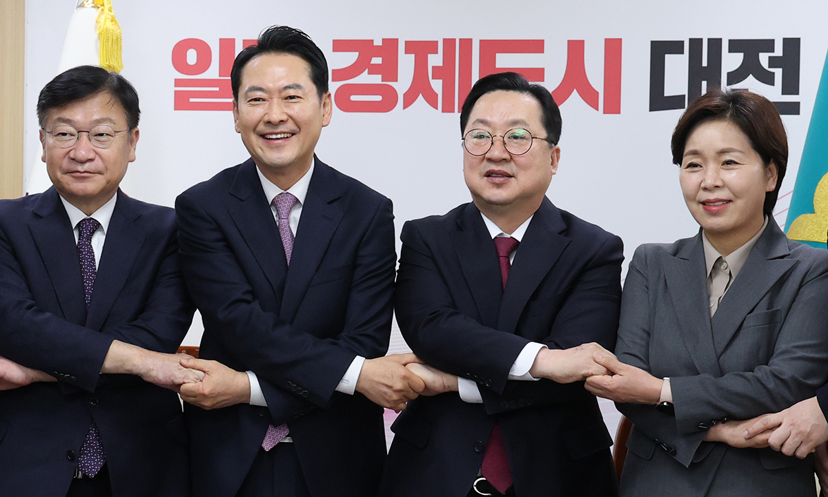 국민의힘 장동혁 대표(왼쪽 두번째)가 14일 오전 대전시청에서 국민의힘 소속 이장우 대전시장(왼쪽 세번째)과 대전·충남 행정통합 관련 정책협의 후 손을 맞잡고 기념촬영을 하고 있다. 왼쪽부터 정점식 정책위의장, 장 대표, 이 시장, 양향자 최고위원.