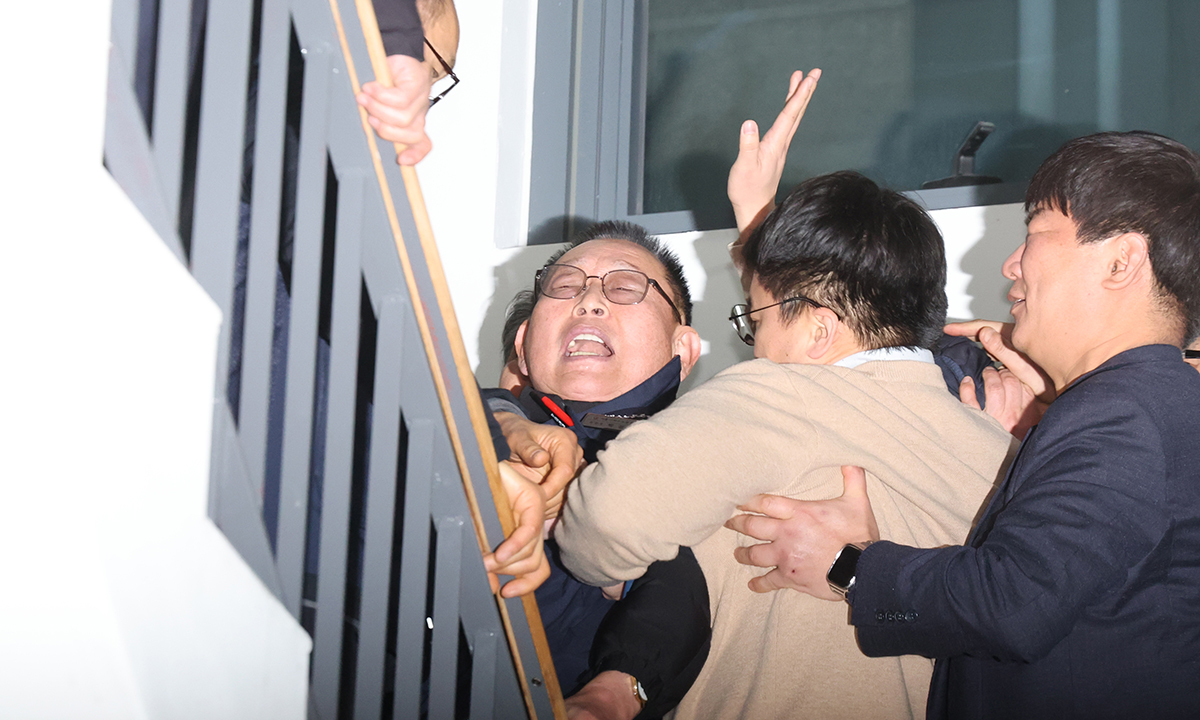 14일 서울 영등포구 서울지방노동위원회에서 열린 특별조정위원회 2차 사후 조정회의에서 박점곤 서울시버스노동조합 위원장(왼쪽)이 회의장을 나서자 회의 관계자들이 이를 만류하고 있다.