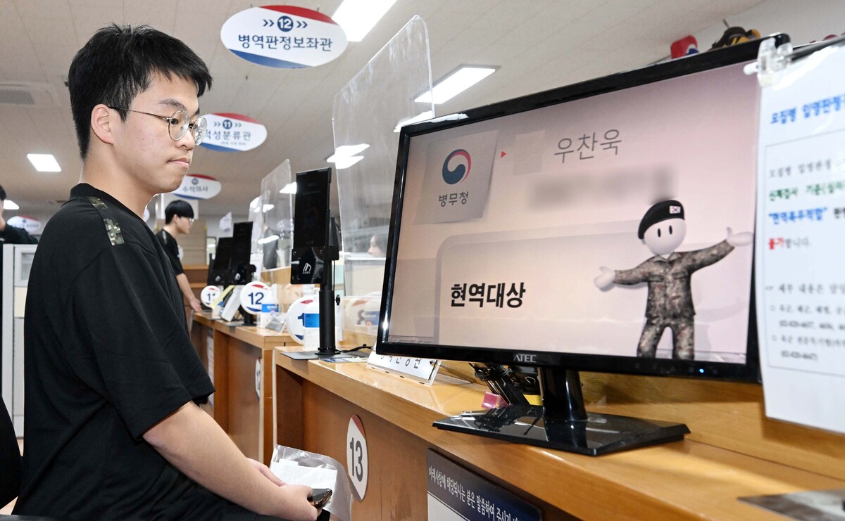 2026년도 병역판정검사가 시작된 15일 서울 영등포구 서울지방병무청 제1병역판정검사장에서 첫 병역판정자가 현역 판정을 받고 있다.